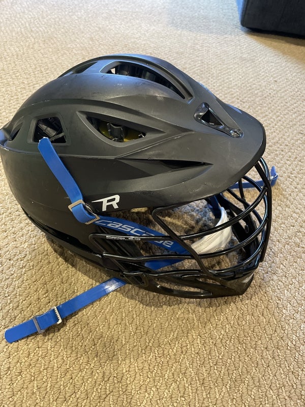 Matte black Cascade R lacrosse helmet. Used, but still in good condition. Missing a helmet screw as shown in picture, but can be easily replaced.