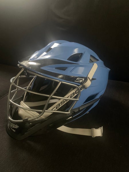 Cascade CS adjustable youth helmet. Light blue with silver cage and black trim. White cascade chin strap