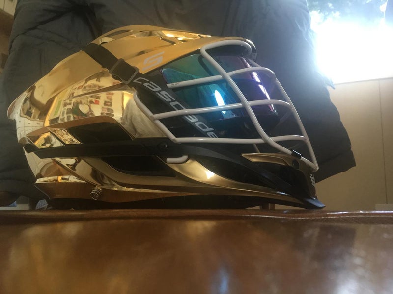 Metallic Gold helmet, white face mask, gold chin. With throne galaxy visor. Brand new never used. Ordered the wrong colors for my high school
