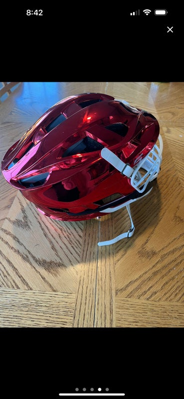 Red chrome lacrosse helmet in great conference.