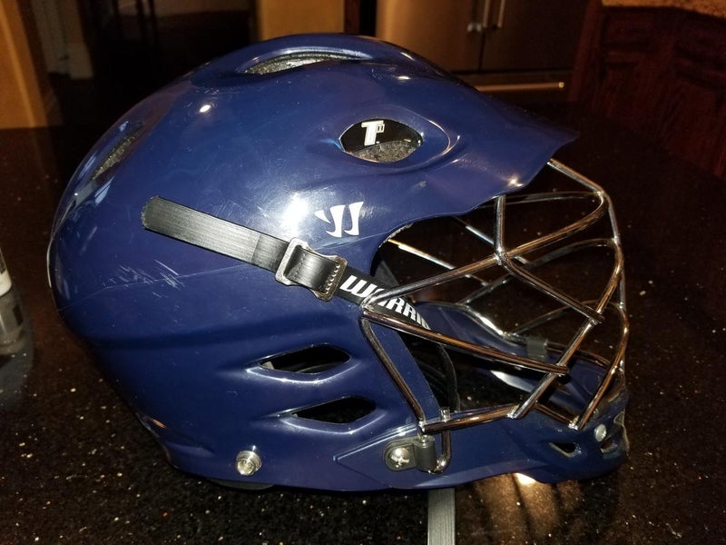 Warrior TII navy blue helmet in almost new condition. It was my son's backup helmet, worn about 3 times. No gauges, rips, tears or wear in lining. Very good condition. I wear a 7 3/8 hat, and I can wear it. Black chin strap in perfect condition.