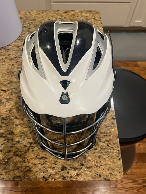 Holes drilled in sides and front for goalie throat guard. Still can be used for field play. Fair condition white and blue cascade pro 7 helmet. One size fits most.