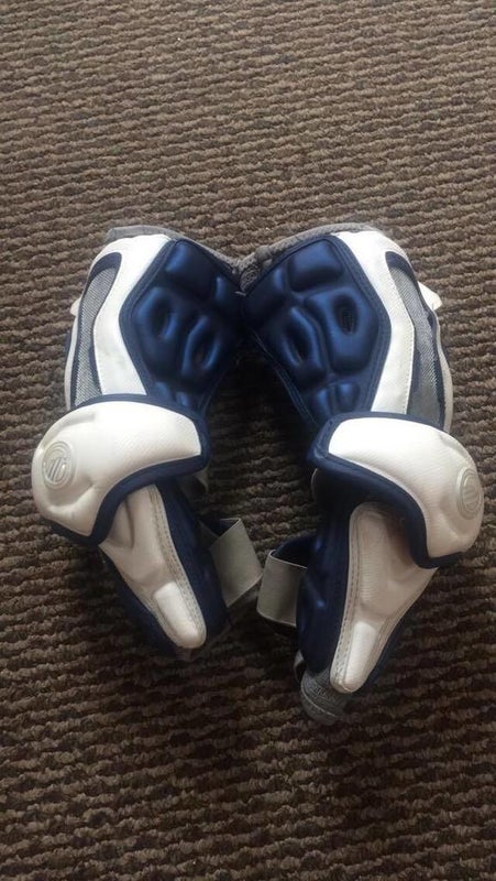 Blue and white elbows pads. Great protection. Used for one indoor winter season. Size M. Run on the bigger side, could fit someone who typically wears a large. Lightly used, great item for a great price.