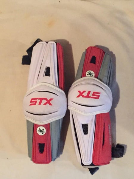 White, scarlet and grey customized OSU STX stallion arm guards. Size Large. Worn for one season. Slight rip underneath in meshing just on the right guard.