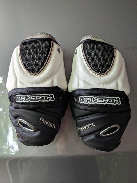 Original Maverick Rome arm pads in black and white. These arm pads are pretty comfortable, flexible, and stay in place due to the inner lining. They are what I would describe as a mid size length so they aren't quite as long as popular pads such as the STX stallions but they are by no means as short as a defensive elbow pad. There is no hard plastics on the arm pad but they don't let heavy checks get through. They fit a medium to large arm (for all you swole men out there) and oddly enough the "shark gel" is placed perfectly where errant slap checks wind up making it weirdly effective.