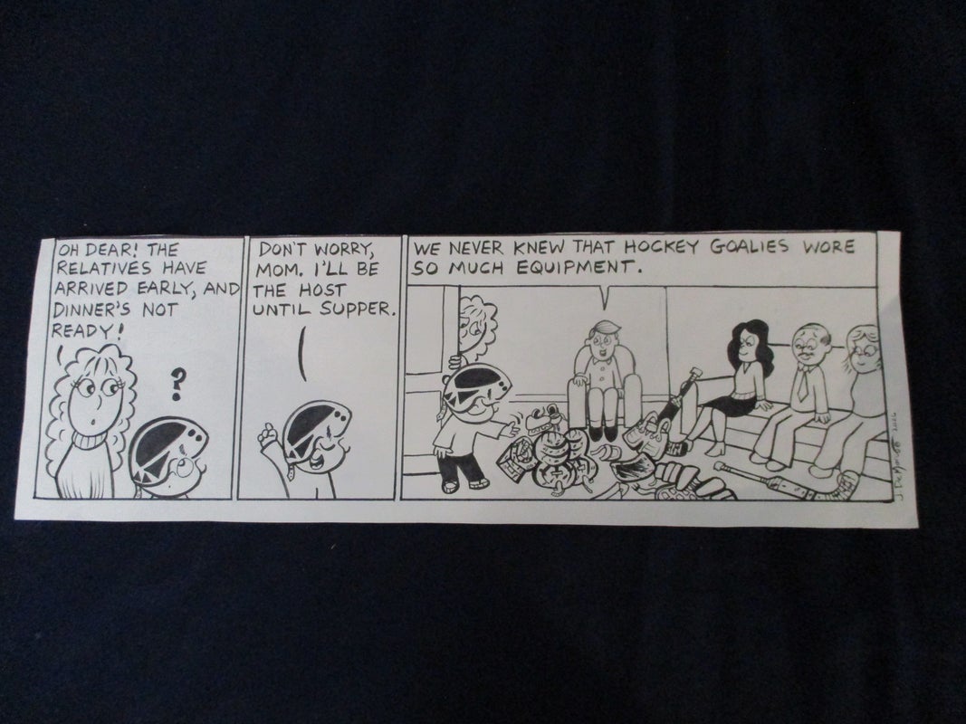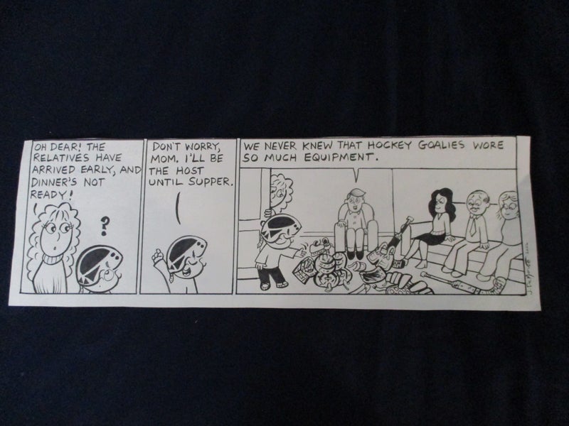 Original Small Saves Hockey Goalie showing Pads Gloves Stick Dinner Host Cartoon