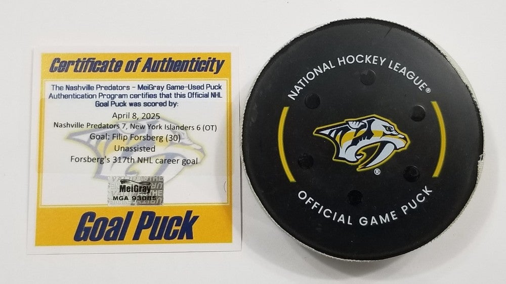 4-8-25 FILIP FORSBERG Nashville Predators vs NY Islanders Game Used GOAL Puck