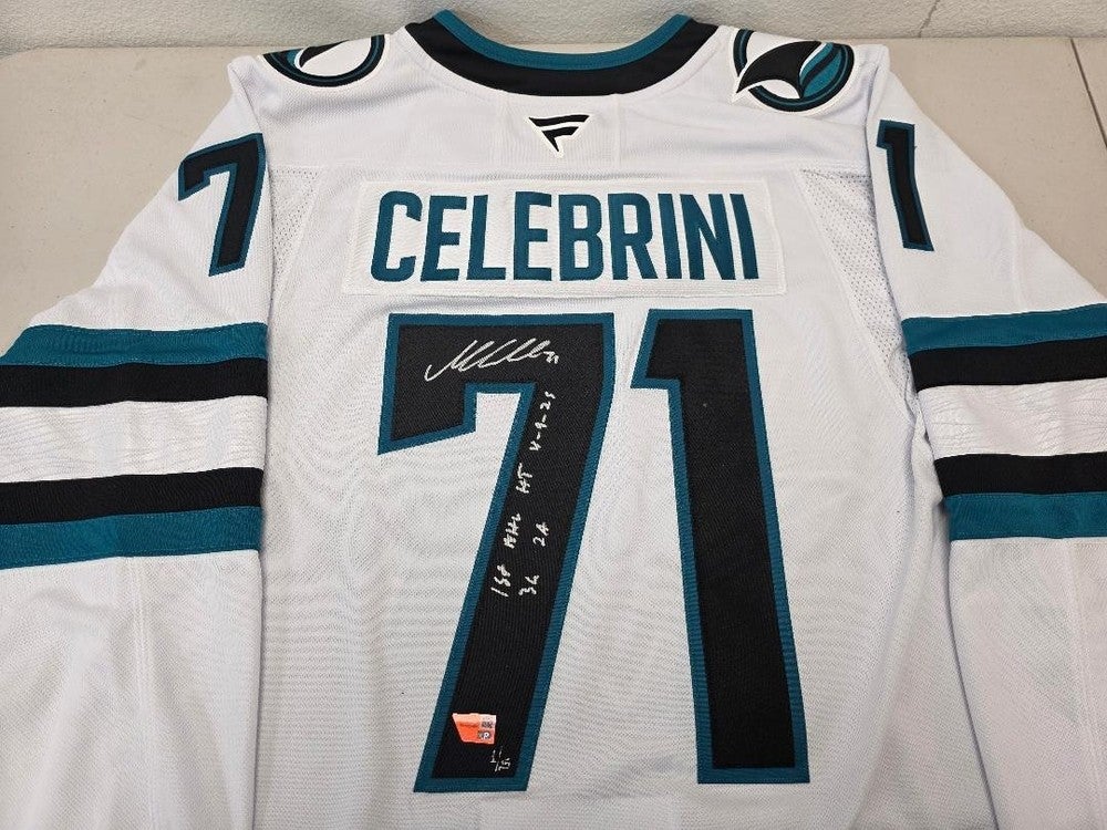 Sharks Macklin Celebrini Signed Auto "1st Hat Trick" LE 1/25 Jersey Fanatics COA