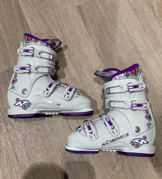 The Nordica GPTJ Ski Boots feature a flexible design that allows for easy movement and skill development, while the pull strap and lift-up buckles make it easy to get in and out of the boots. The GPTJ skis also feature a Cuff Shape that provides maximum comfort for all day skiing, while allowing enough flex to switch up riding styles.