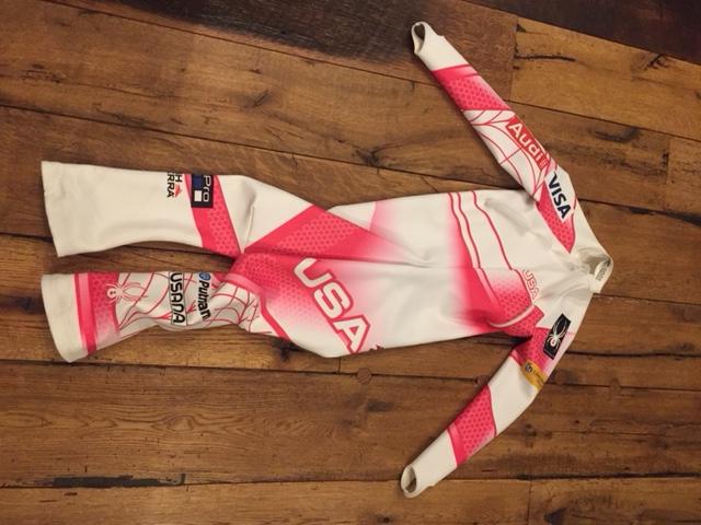 Official US Ski team speed suit. This suit which is a Medium Large is in perfect condition, there are no cuts or burns and could be considered brand new. Worn by one of the US "A" speed team members in one event, this suit is now for sale and can be yours. Please contact me with any questions.