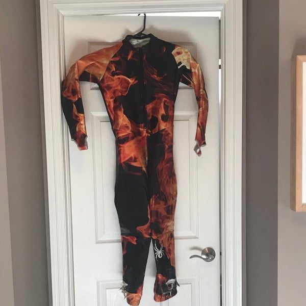 Spyder kids size 14/16 flames race suit. Good for a younger racer/training suit. Some scruff marks behind the knees and very worn at the ankles.