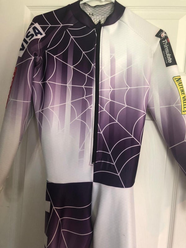 This suit is a large long but it fits a standard women's medium. There are NO holes but there are a few marks on the legs and a little bubble by the stomach. This suit was only worn a handful of times so it is still in great shape!