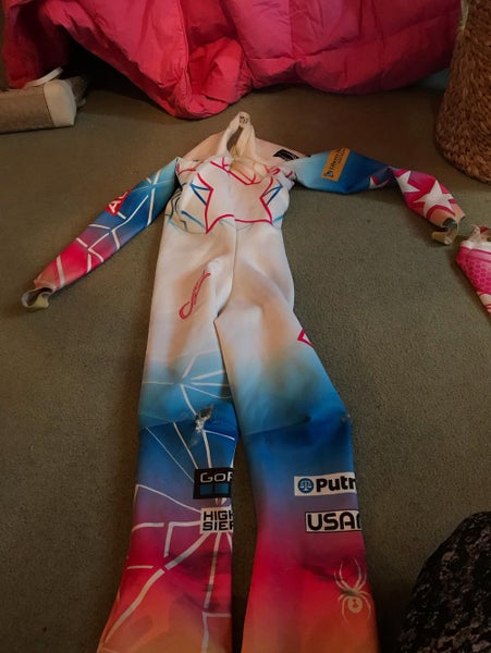 Used US ski team Lindsey Vonn suit. It has rips in the right knee and arm but still in good condition. I raced in it all year. I am 5 6’ 140 pounds and it fits perfect.