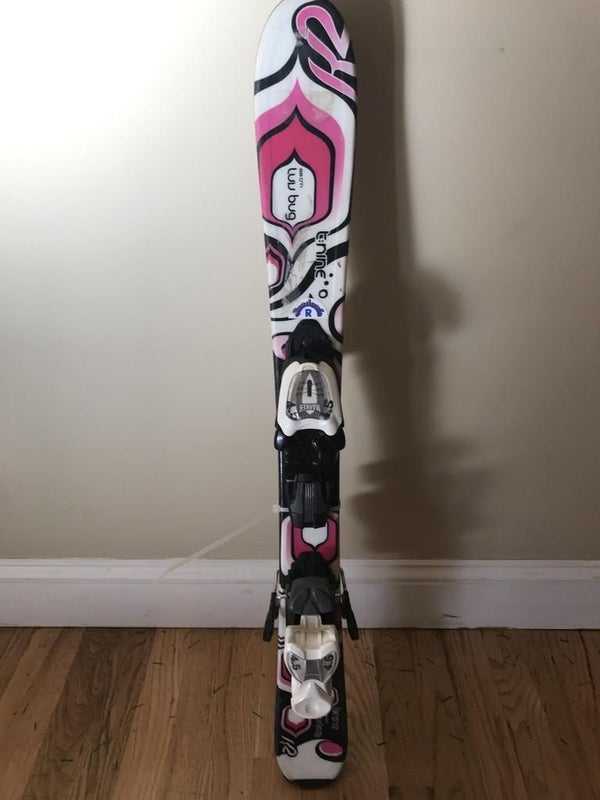 The K2 Luv Bug skis, paired with the FDT 4.5 bindings, are specifically designed to make a young skier's first experience on the slopes fun and successful. These skis are sized appropriately for smaller frames and feature an exceptionally forgiving, soft, and lightweight construction that promotes effortless progression. The catch-free rocker profile is a standout feature, minimizing edge catches and making turning and learning significantly easier, allowing beginners to focus on developing their skills in a safe and enjoyable environment.