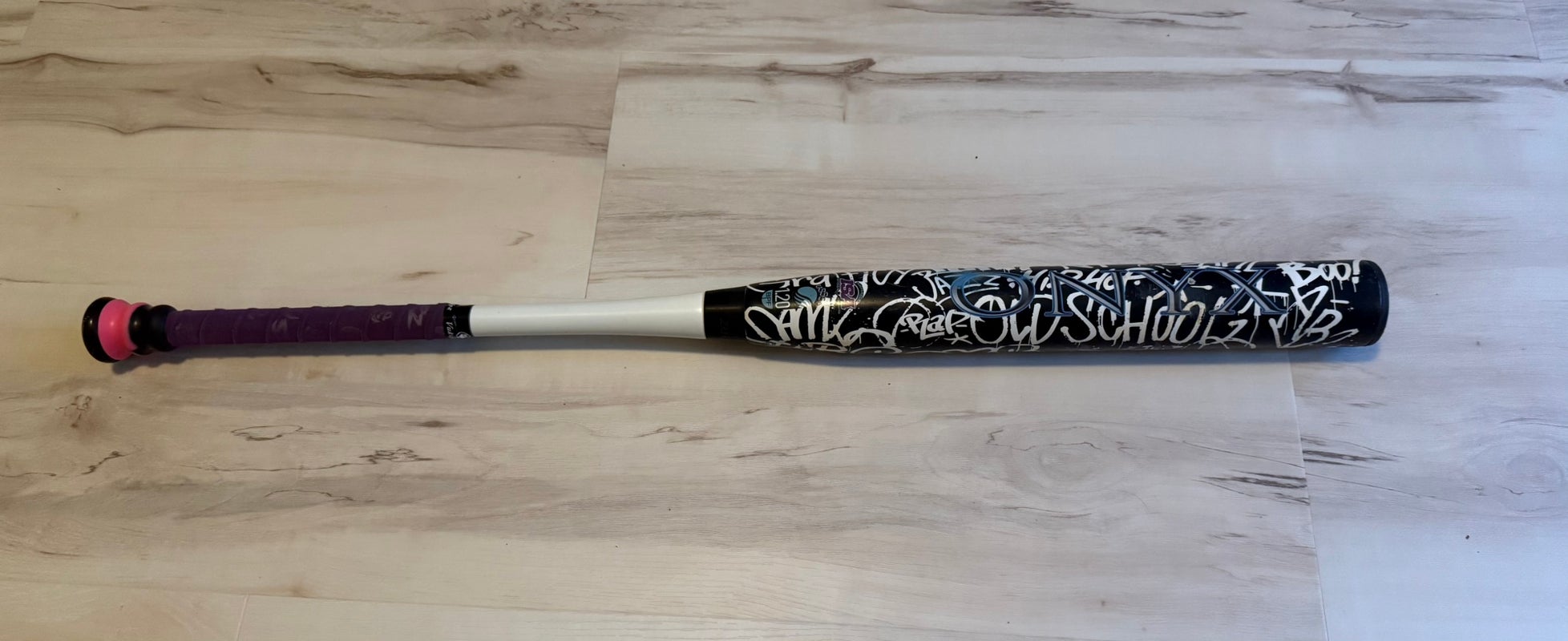 This is an Onyx slowpitch softball bat, model number ESS19-2. It is a 34-inch bat with a 26-ounce weight, featuring a drop of -8. The bat is black in color and was made in the United States. It has been used only a couple of times, solely in batting practice, and is in clean condition. The bat is USSSA 1.20 certified and ISA approved, meeting the standards for slowpitch softball play.