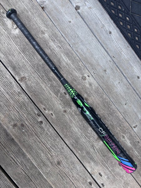 This is a 2015 DeMarini CF7 Composite bat designed for fastpitch softball, measuring 32 inches in length with a 22-ounce weight and a -10 drop. It’s in great used condition, having been played for only half a season. The bat shows no cracks, rattles, wobbles, or gauges, and only has light surface scratches from regular use. The composite material remains solid, contributing to a good swing feel and consistent pop. The black grip shows some wear but remains fully functional without any issues.