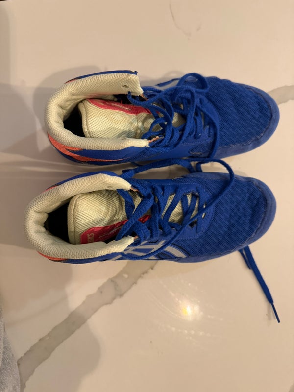 These Asics wrestling shoes are a size 4.5 and have been worn only about three times. They are in used condition but show minimal signs of wear given the limited use. The shoes would be suitable for someone looking for a lightly used pair of wrestling footwear in a smaller size.