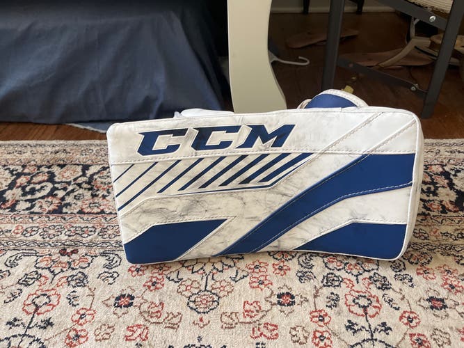 • Goalie Hockey Blockers: Worn on the dominant hand, blockers help direct pucks away from the net. Good blockers should feel well-balanced and provide a strong rebound off the board. Look for an adjustable wrist strap, reinforced finger protection, and a high-quality palm that maintains grip over time. Bauer hockey goalie blockers and CCM hockey goalie blockers are well-known brands that offer lightweight builds.