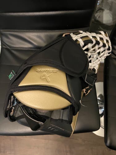• Goalie Catch Gloves: Also known as the trapper, this glove catches pucks and protects the hand from high-speed shots. Important factors include glove break angle (e.g., 580, 590, 600), pocket depth, and backhand protection. Players should try different break styles to find what feels most natural.