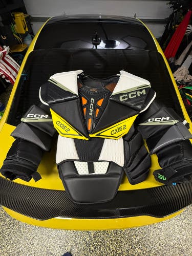 Unlike player equipment, goalie gear is highly specialized and includes leg pads, blockers, catch gloves, chest and arm protectors, goalie masks, goalie skates, and often pants and knee guards
